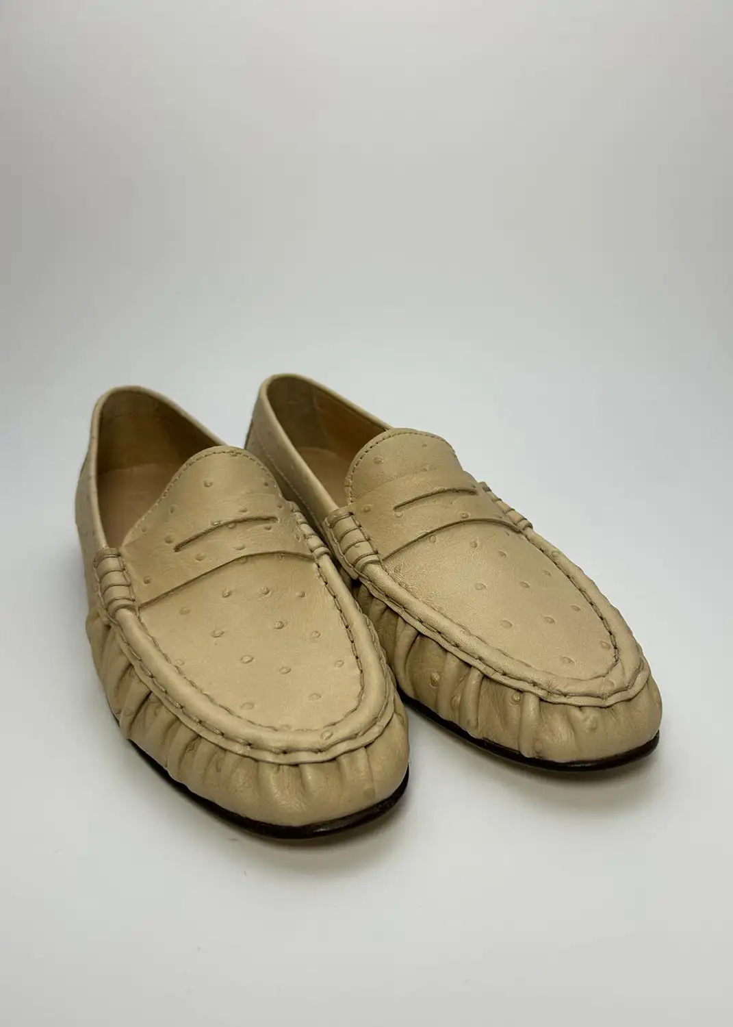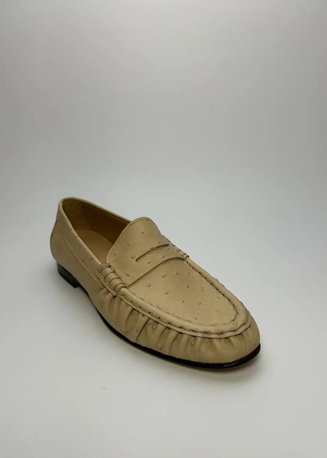 La distintiva superficie dello struzzo, con le sue delicate perle, offre un appeal visivo e tattile unico. Frutto di un'artigianalità impeccabile, ogni paio incarna l'eccellenza, adattandosi con grazia ad ogni momento della tua giornata.L'Icona del Tuo Stile
