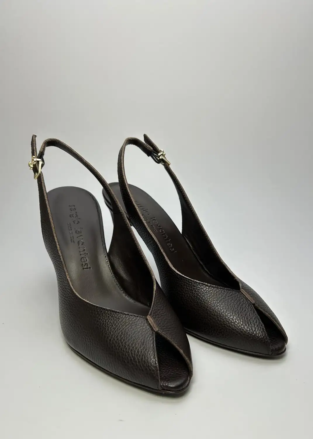 Le sling back di Sergio Levantesi incarnano l'eleganza per la Primavera-Estate. Il profondo color testa moro, un classico intramontabile, dona sofisticata versatilità, elevando ogni outfit. Lusso discreto e raffinatezza contemporanea.Dettagli di Classe